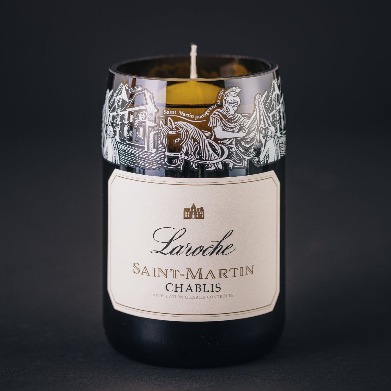 Le photophore est entièrement fabriqué à partir d'une bouteille de vin recyclée de la cuvée Saint-Martin qui est un hommage à la naissance des vins de Chablis et à leur héritage de plus de 1000 ans d'histoire.